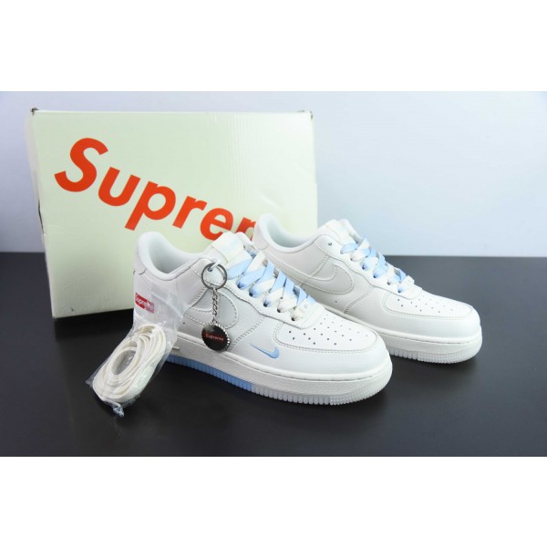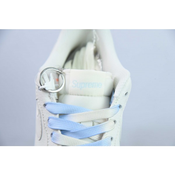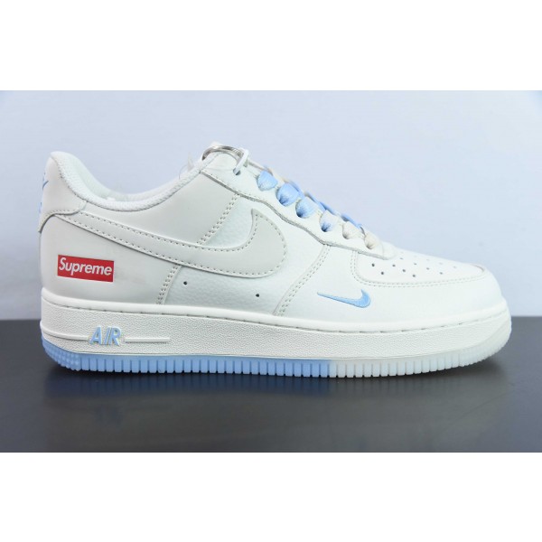 Nk 에어 포스 107 로우 슈프림 공동 브랜드 화이트 및 블루 더블 스펠링 에어 포스 1 로우 탑 캐주얼 보드 쇼츠 제품 번호: BB9599-202 사이즈: 36-44